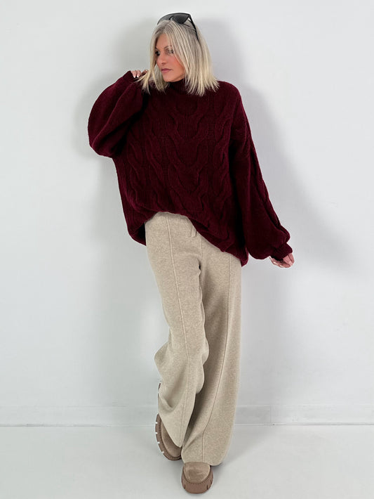 Casual cable-knit sweater, "Pure Cable" model - burgundy