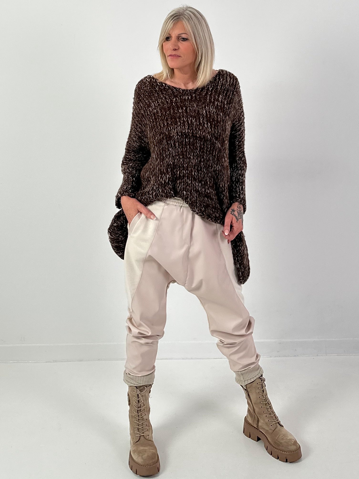 Two materials, one look with character. The Baggy Love Duo plays with contrasts – matte jersey panels meet sophisticated leather-look fabric, creating an exciting dynamic between street style and fashion. The elasticated waistband with drawstring ensures comfort, while the two front pockets and two back pockets add a functional touch. Casual, modern, and uncompromisingly comfortable. For days when you feel stylish but need freedom.
