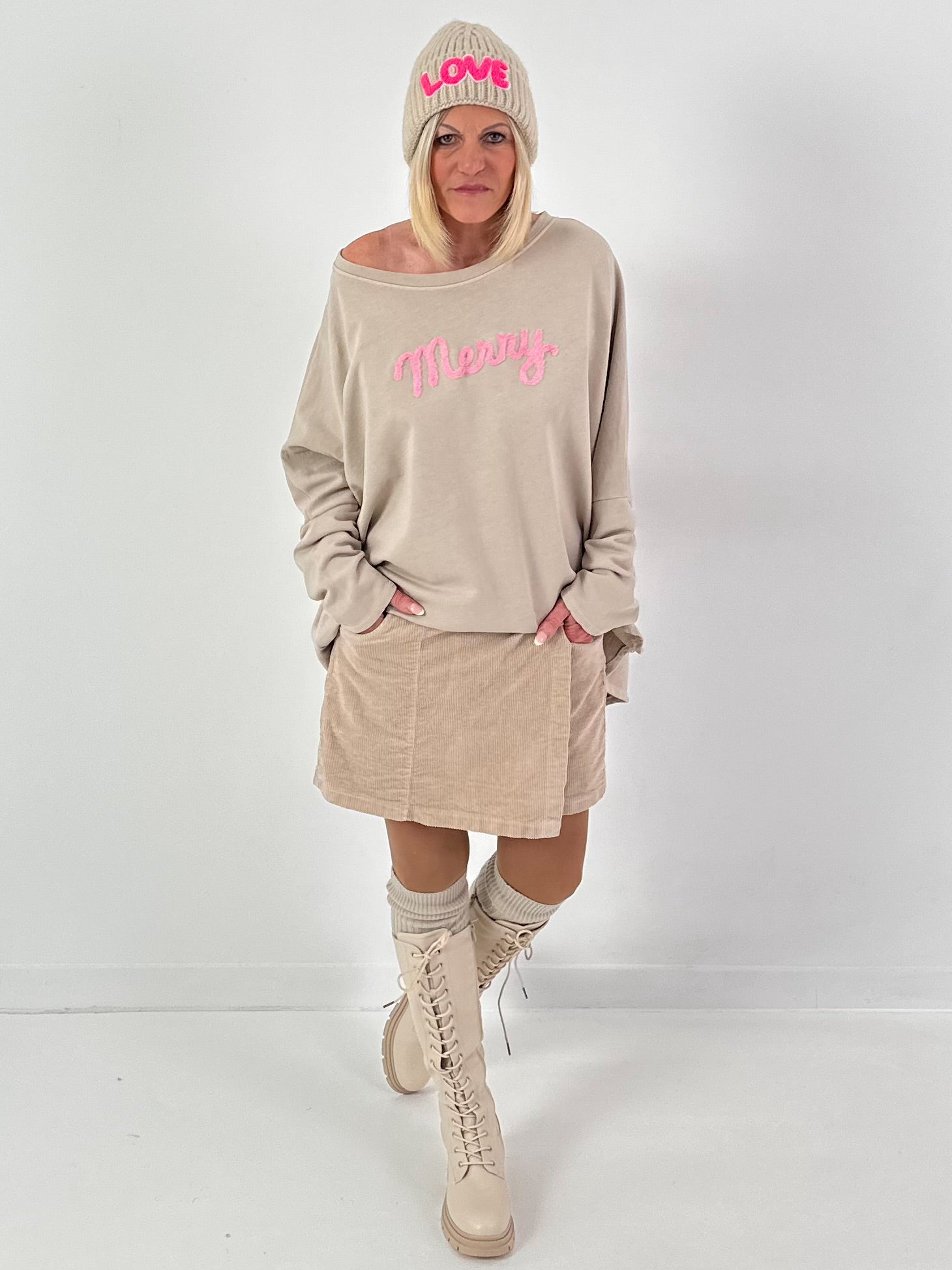 An oversized sweatshirt that radiates good vibes. The crew neck and dropped shoulders ensure a relaxed fit, while the fluffy pink teddy logo provides a soft contrast. Slightly cropped at the front, with a soft interior – perfect for casual days with a touch of "Merry Mood".
