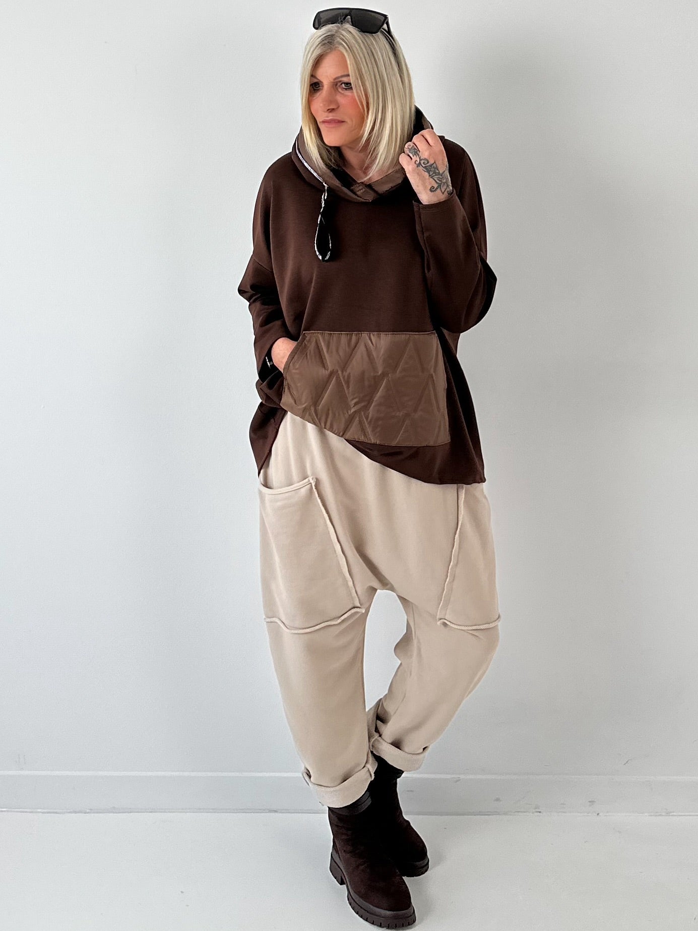 This sweatshirt is the perfect addition to your casual wardrobe. It features a trendy, loose fit. A special eye-catcher is the large, patch kangaroo pocket with a quilted look, which gives the sweatshirt a modern touch. The slightly shiny, quilted material creates an exciting contrast to the rest of the fabric. The back panel, with a drawstring and slit, is cut slightly longer, creating a great silhouette. The sweatshirt is versatile and can be combined in many different ways.