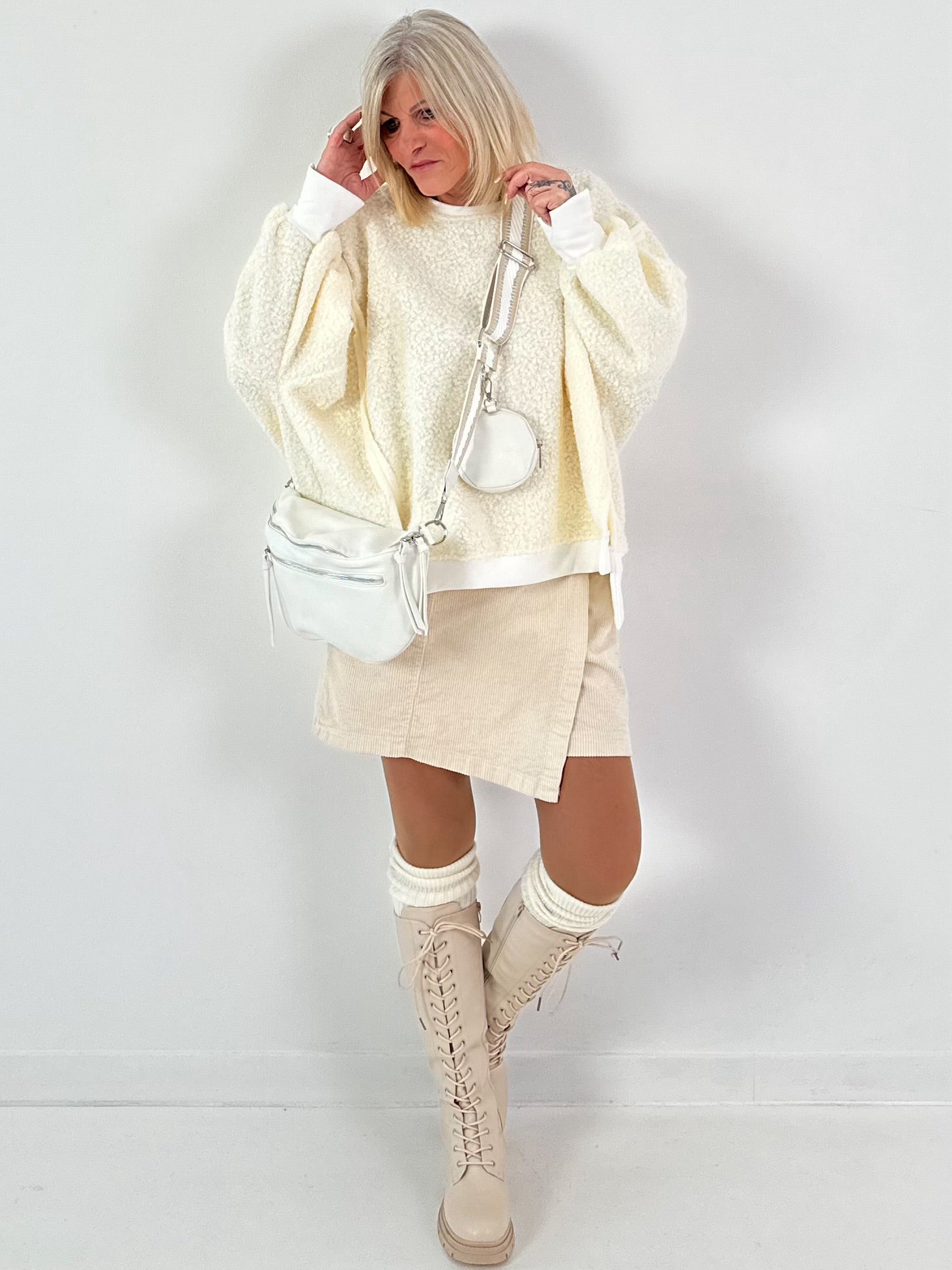 Soft, casual, and simply perfect for snuggling up in. Sweet Bliss combines the trendy teddy look with sporty sweat details at the hem and sleeves. The cut is oversized with dropped shoulders and slightly shorter in the front – a modern style for relaxed days and good vibes.