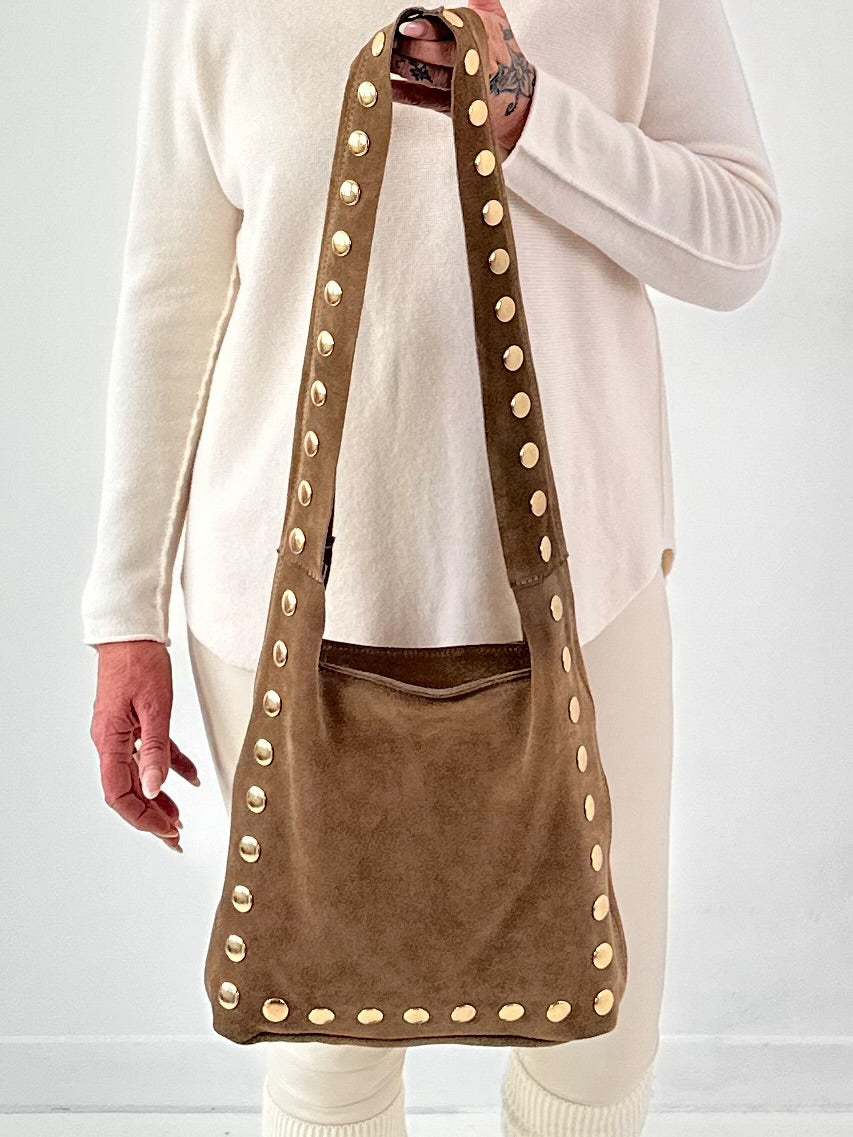 Soft suede meets clean lines. The striking gold studs lend the bag a modern, confident touch without being ostentatious. Worn casually over the shoulder, it goes just as well with jeans as it does with a coat and boots. Uncomplicated, sophisticated, and perfect for everyday use.