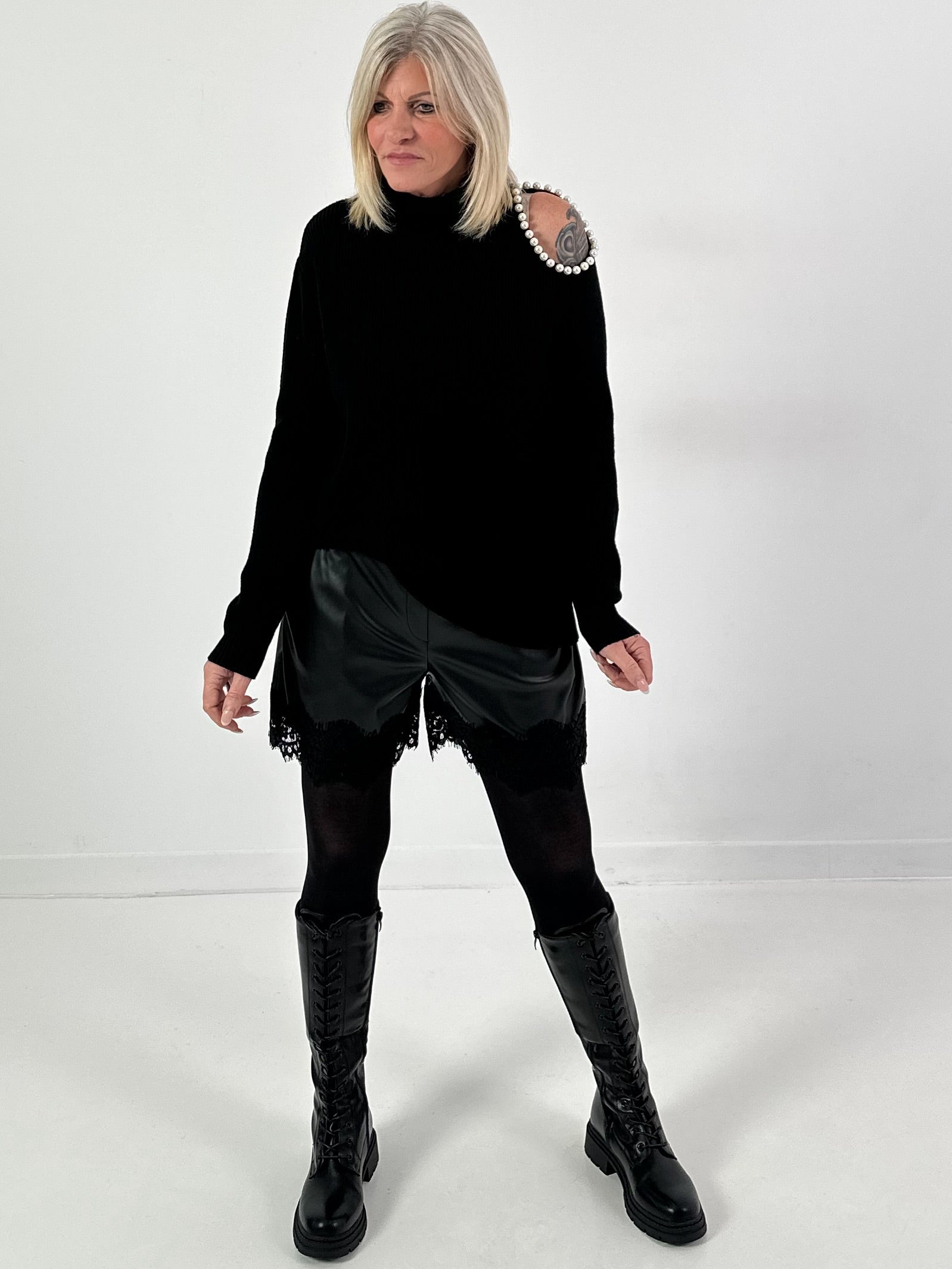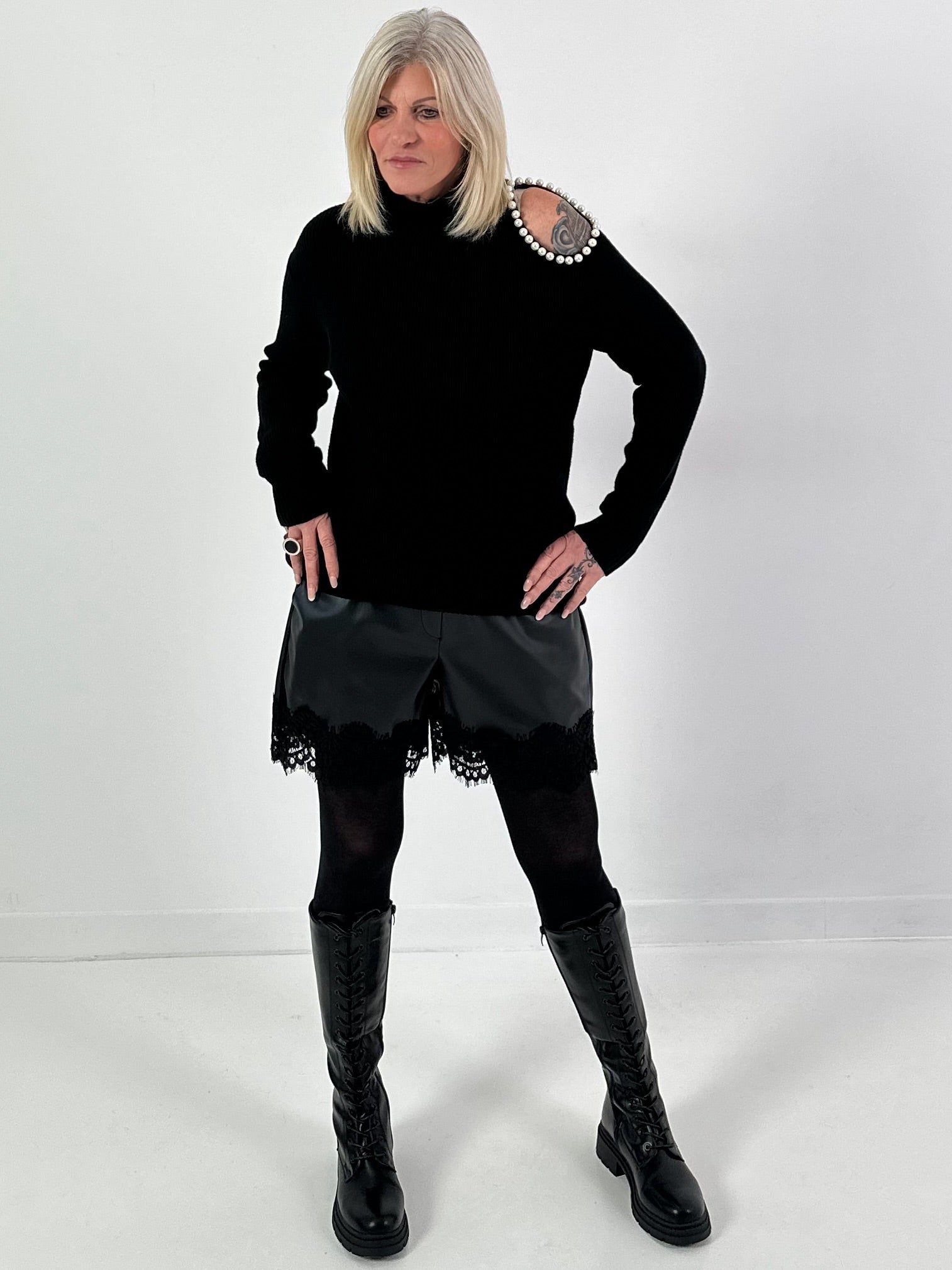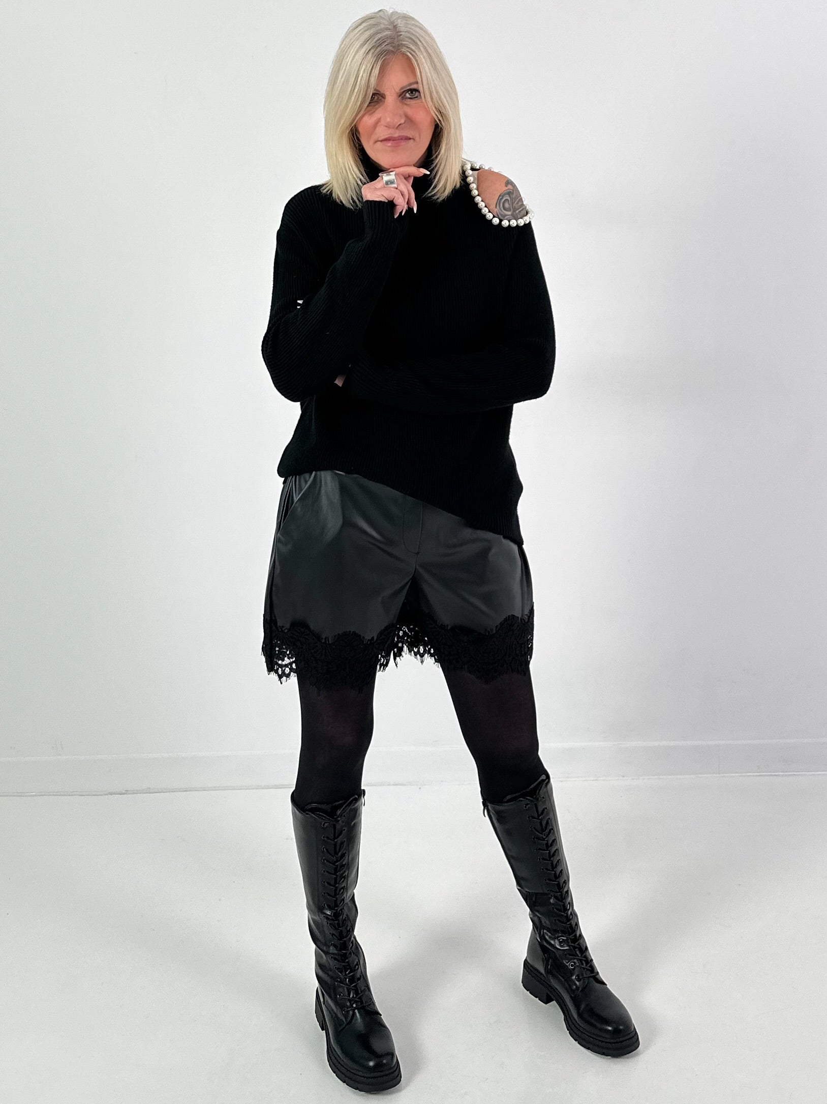 Elegance with a touch of rebellion: Shorts in a sophisticated leather look with delicate lace trim at the leg openings. Side pockets and an elasticated waistband at the back ensure comfort and a relaxed fit. A mocha-colored belt completes the look. These shorts play with contrasts of coolness and sophistication.