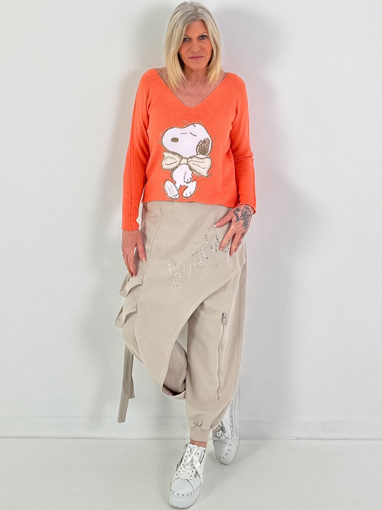 The front features a popular cartoon print, giving the sweater a playful yet stylish touch. Sparkling rhinestones add subtle highlights and create an elegant eye-catcher without being ostentatious.