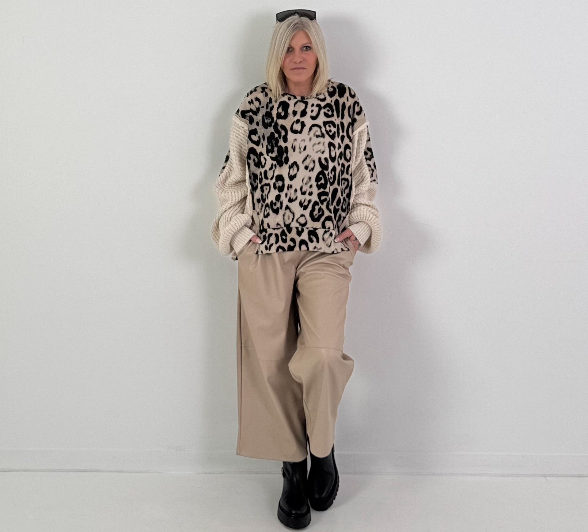 This sweater combines the best of both worlds: cuddly soft sweatshirt fabric meets chunky knit sleeves. The striking leopard print is a real eye-catcher and creates a modern, casual look. Small slits at the sides add movement to the cut, while the soft interior ensures ultimate comfort. A statement piece for relaxed days in style.