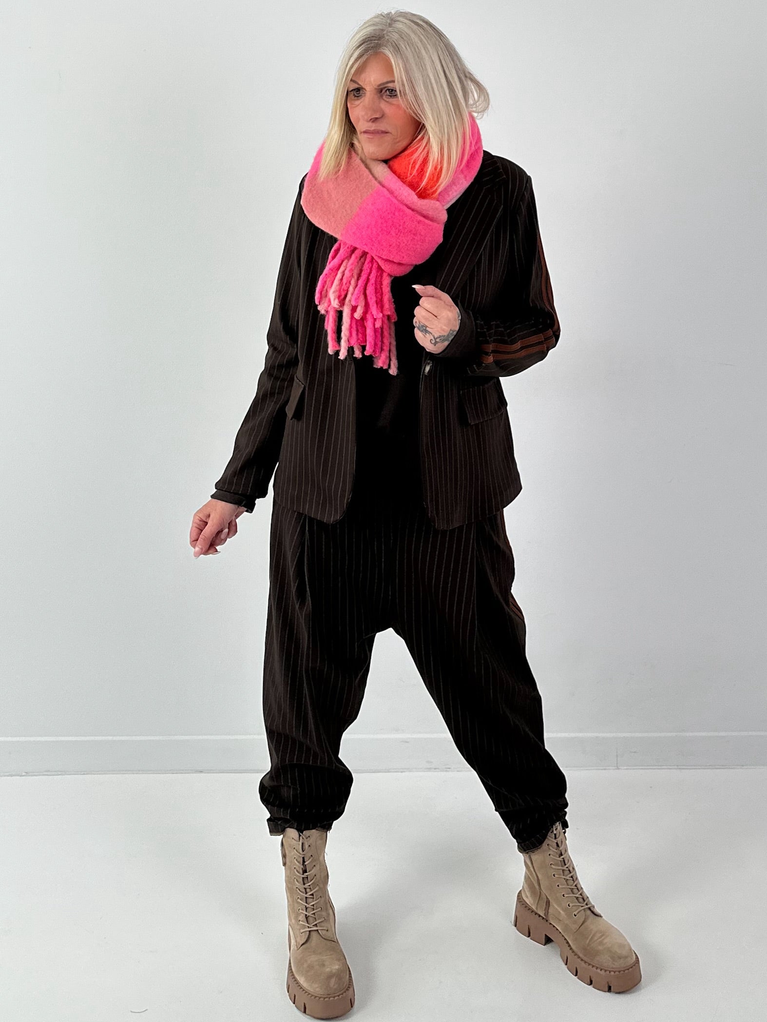 Dieser moderne Blazer kombiniert klassische Eleganz mit sportiven Details. Das feine Nadelstreifen Muster wird durch die markanten Streifen über Arm und Schulter neu interpretiert und sorgt für einen spannenden Kontrast. Schulterpolster verleihen eine schöne Silhouette, während der klassische Reverskragen und der einzelne Knopf zum Verschließen den zeitlosen Blazer Charakter unterstreichen. Dekotaschen runden das Design ab. Dank des stretchigen Materials trägt sich der Blazer besonders angenehm und passt sich jeder Bewegung an – ein vielseitiges Lieblingsstück für Office-Looks und moderne Alltagsmode.