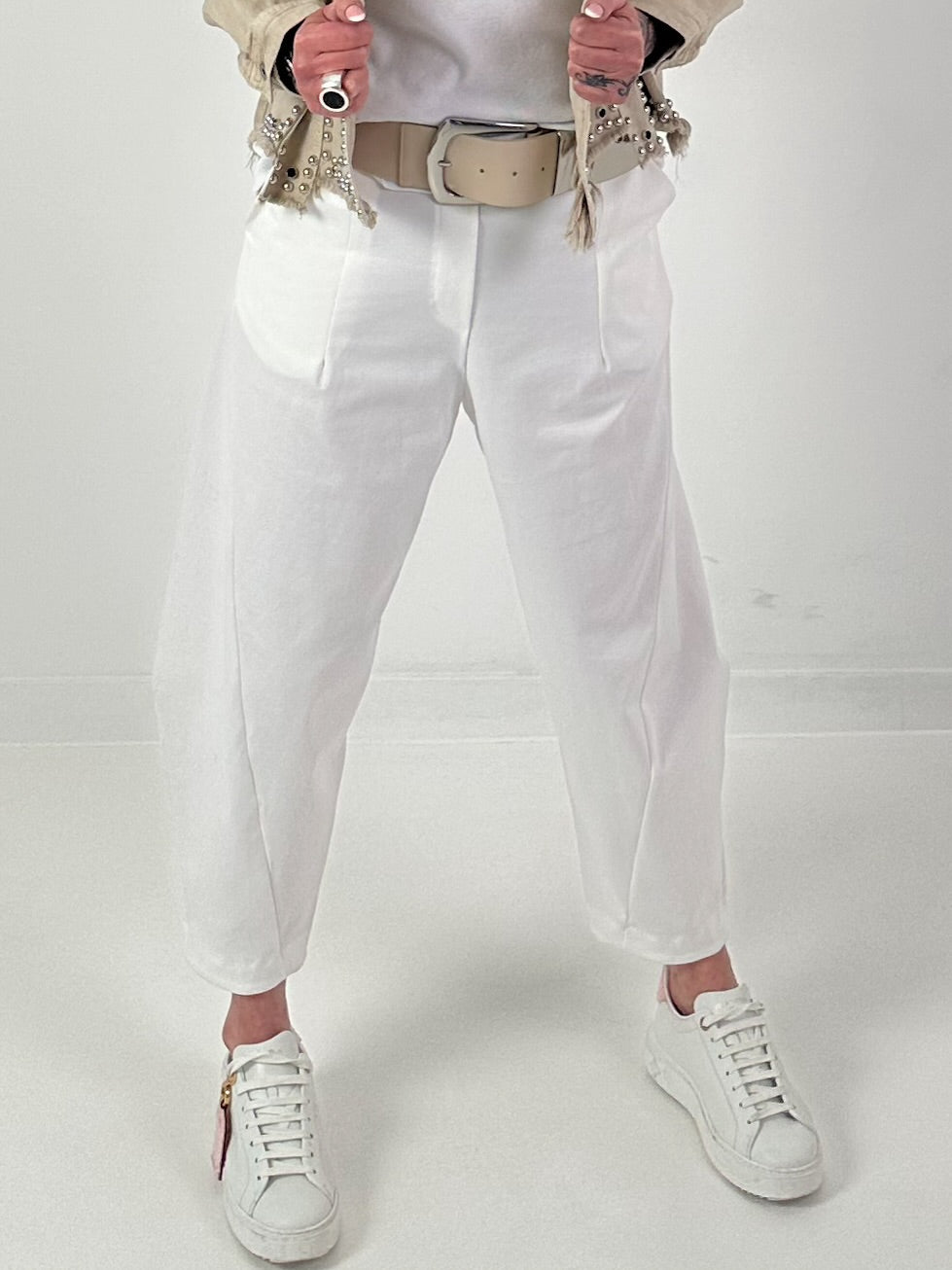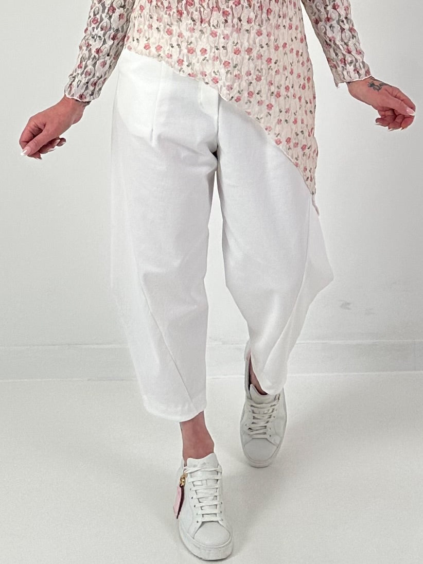 Diese Ballonhose vereint modernen Schnitt mit elegantem Minimalismus. Der formstabile, dennoch angenehm leichte Stoff sorgt für einen schönen Fall und unterstreicht die besondere Silhouette. Typisch für den Ballon-Schnitt verläuft die Hose locker über Hüfte und Oberschenkel und wird zum Beinabschnitt schmaler, wodurch die charakteristische, voluminöse Form entsteht. Der elastische Bund auf der Rückseite bietet zusätzlichen Tragekomfort und passt sich flexibel an. Ein markantes Design-Detail ist die asymmetrisch verlaufende Naht auf der Vorderseite, die der Hose eine moderne, architektonische Linie verleiht und den cleanen Look stilvoll aufbricht. Seitliche Eingriffstaschen ergänzen die Funktionalität, ohne die minimalistische Optik zu stören.