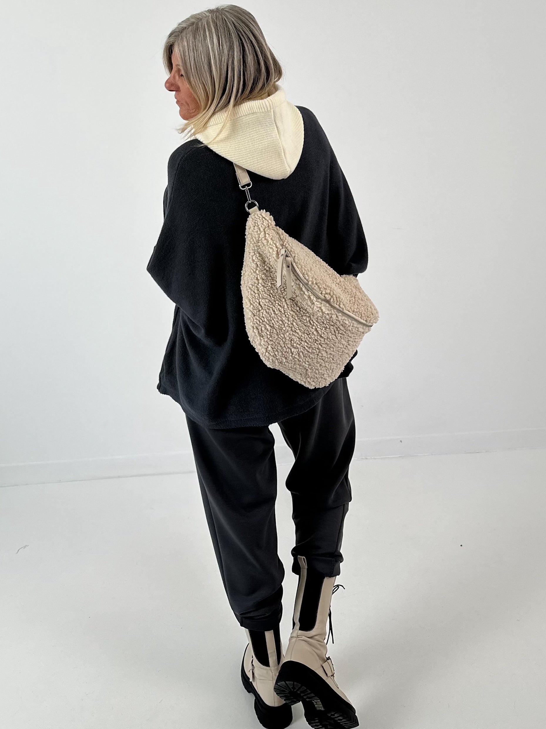 This large, cozy crossbody bag combines casual comfort with elegant details. The soft teddy fur gives it a trendy yet cozy touch. The adjustable genuine leather shoulder strap ensures stability and durability. It features a spacious interior compartment and a two-way zipper with small leather pulls. This beautiful bag is versatile and will become your new favorite accessory when worn with other accessories.