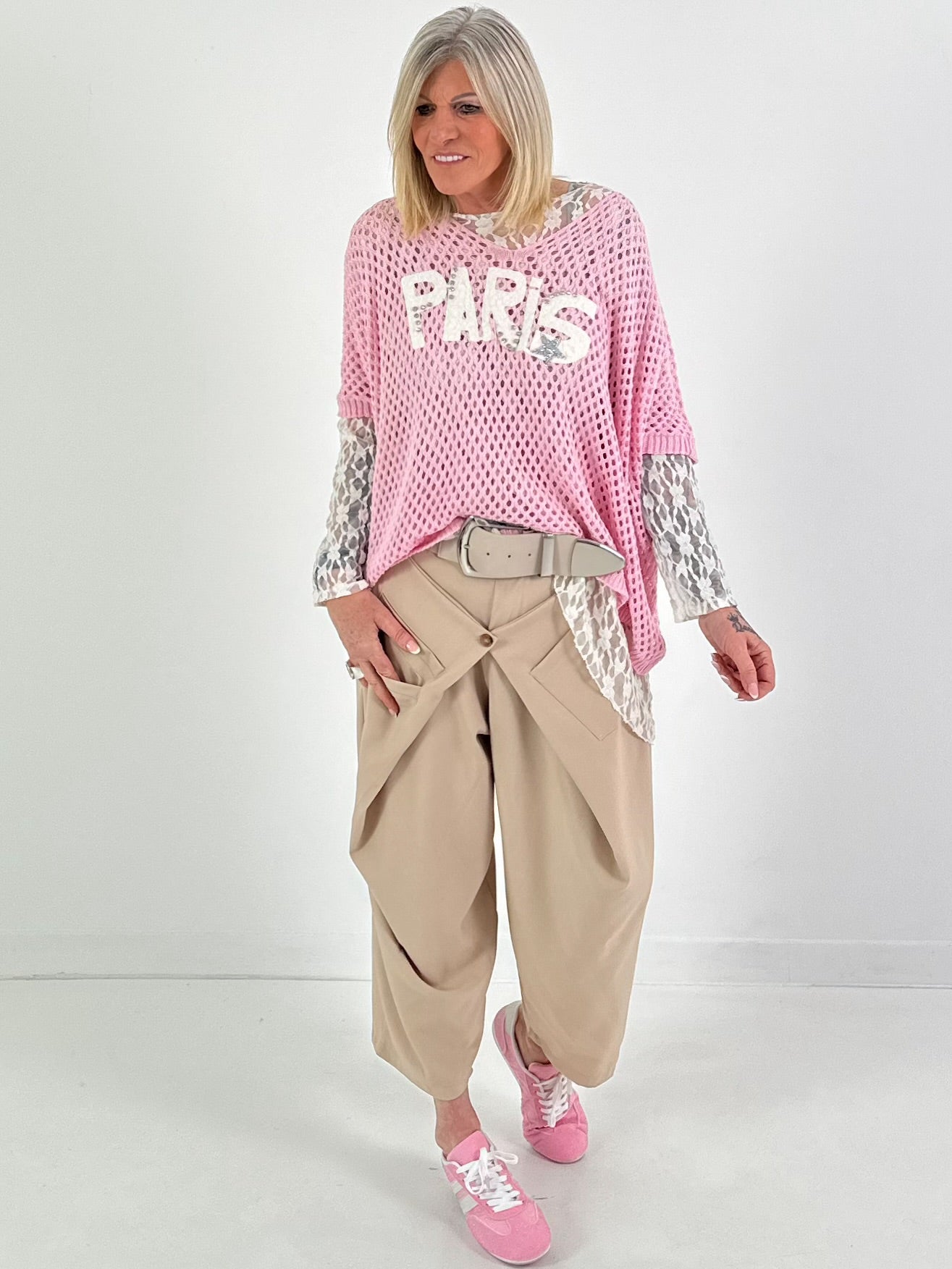 A breezy crochet top in finely crafted openwork knit with an exceptional design. The relaxed fit ensures a casual, flowing drape and superior comfort. A striking statement lettering on the front, embellished with sparkling rhinestone details and a star accent, makes this top a real eye-catcher. The slightly sheer fabric lends a modern lightness to the look and makes it ideal for layering over tops or dresses. Perfect for creating individual styles with a unique character.