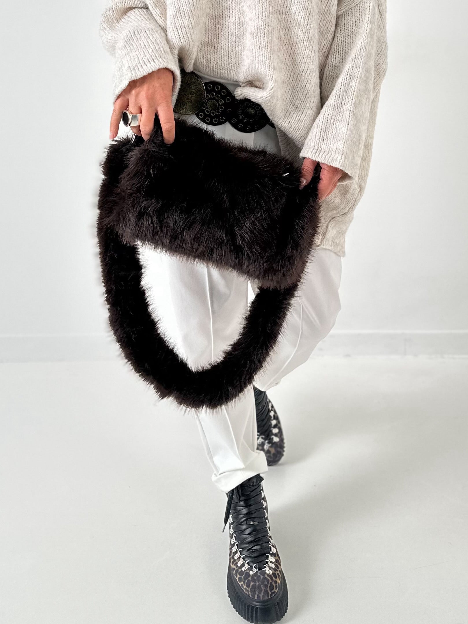 A beautiful, unusual, fluffy hand warmer with an inner pocket in a trendy faux fur design. The practical pocket closes with a zipper. The high-quality, ultra-soft faux fur adds a fashionable touch. An absolutely luxurious and stylish accessory – combining warmth and functionality with modern materials. Ideal for the fashion-conscious.