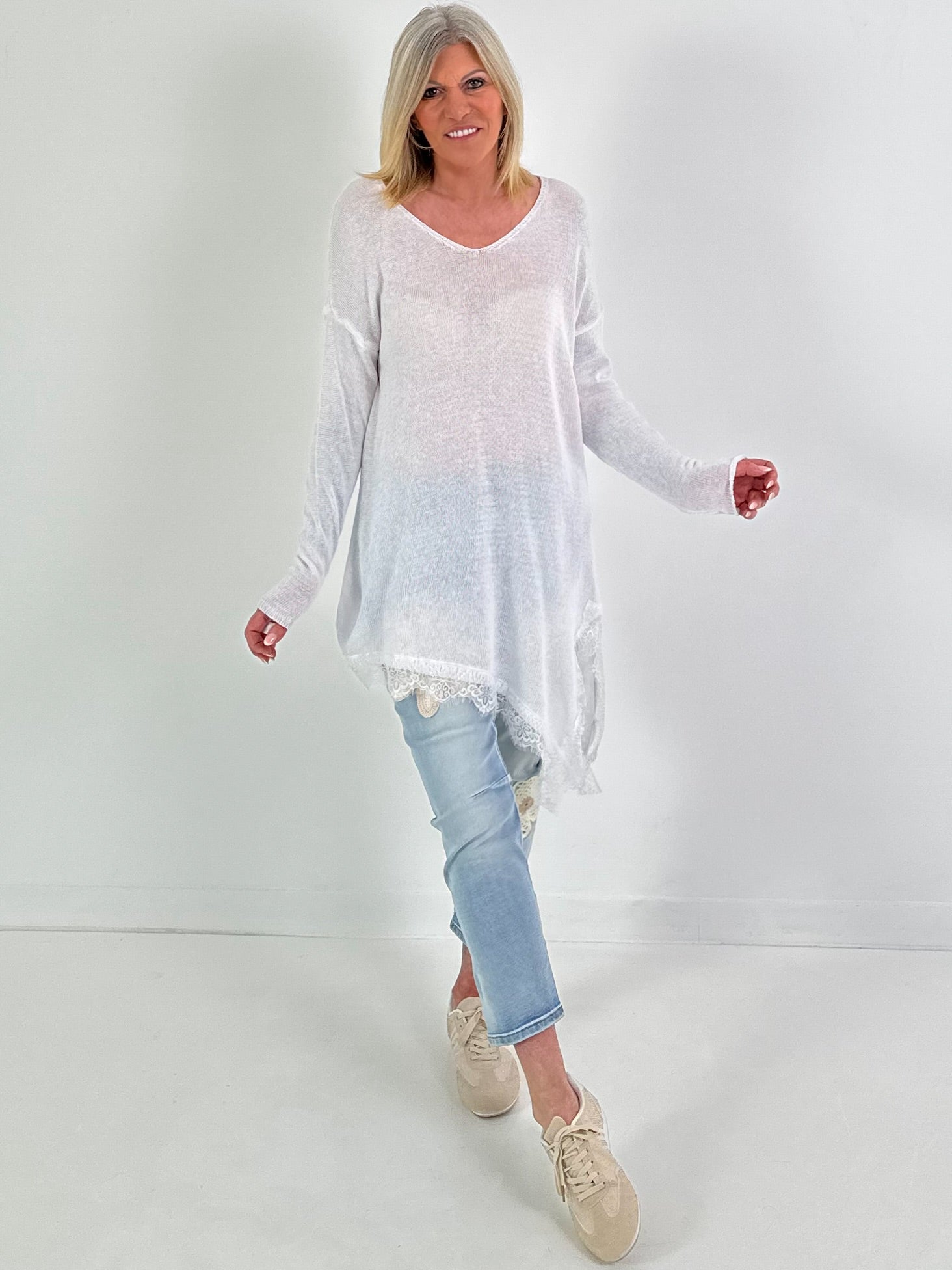 A lightweight summer knit sweater with a feminine V-neck and a modern, asymmetrical cut. The fine, airy knit fabric ensures a comfortable feel and makes this sweater ideal for warm days. The side slit adds a casual touch and provides extra freedom of movement. A decorative lace trim at the hem adds a stylish, playful accent and harmoniously completes the look. The relaxed fit makes the sweater versatile – perfect for casual leisure outfits as well as elegant summer layering.