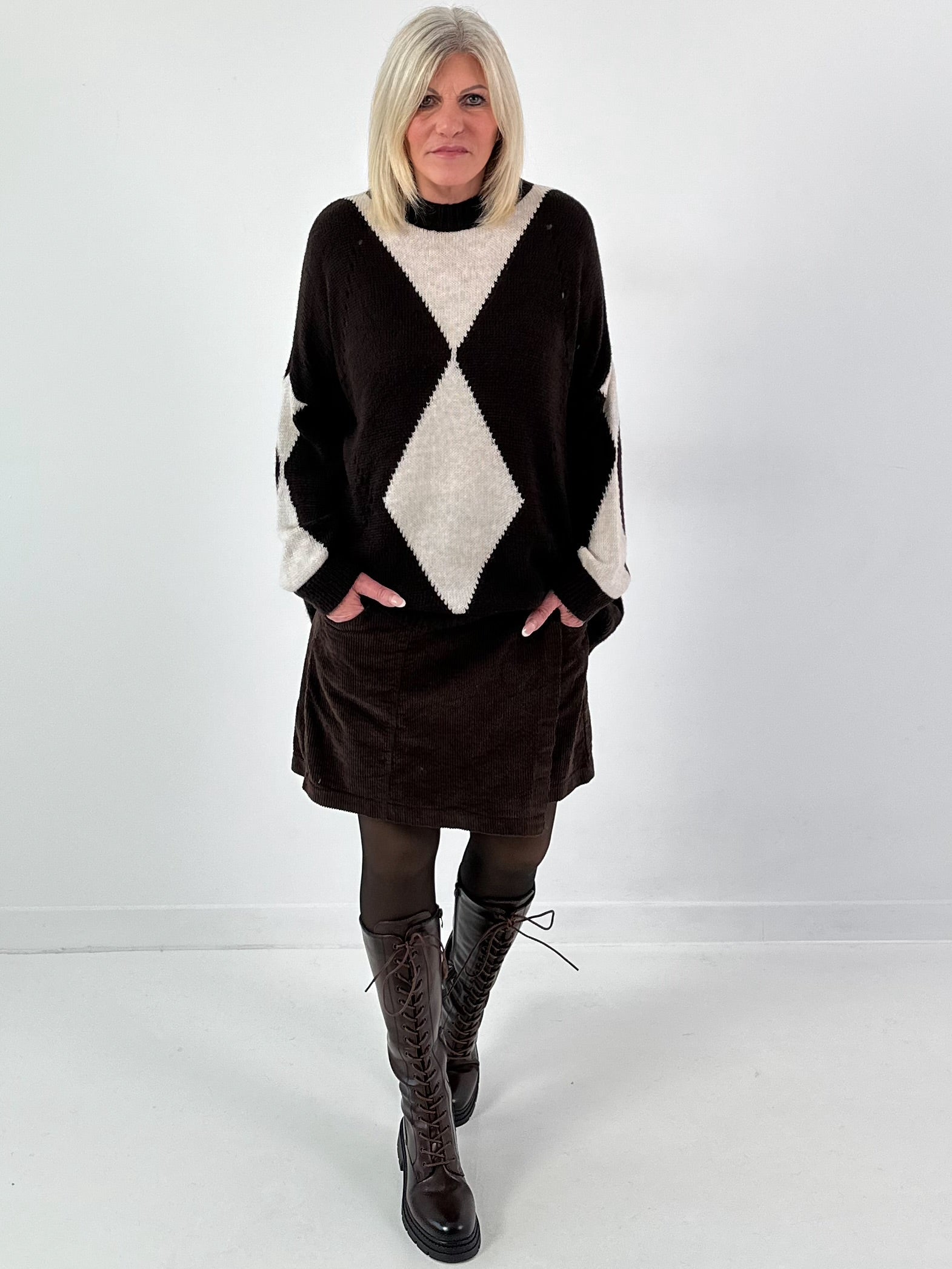 A sweater with character, the graphic rhombus pattern immediately catches the eye. The fine openwork knit adds structure and lightness. The ribbed knit at the collar, hem, and sleeves provides a relaxed fit. Soft to the touch, modern in look – a piece for those who like it striking and effortless.