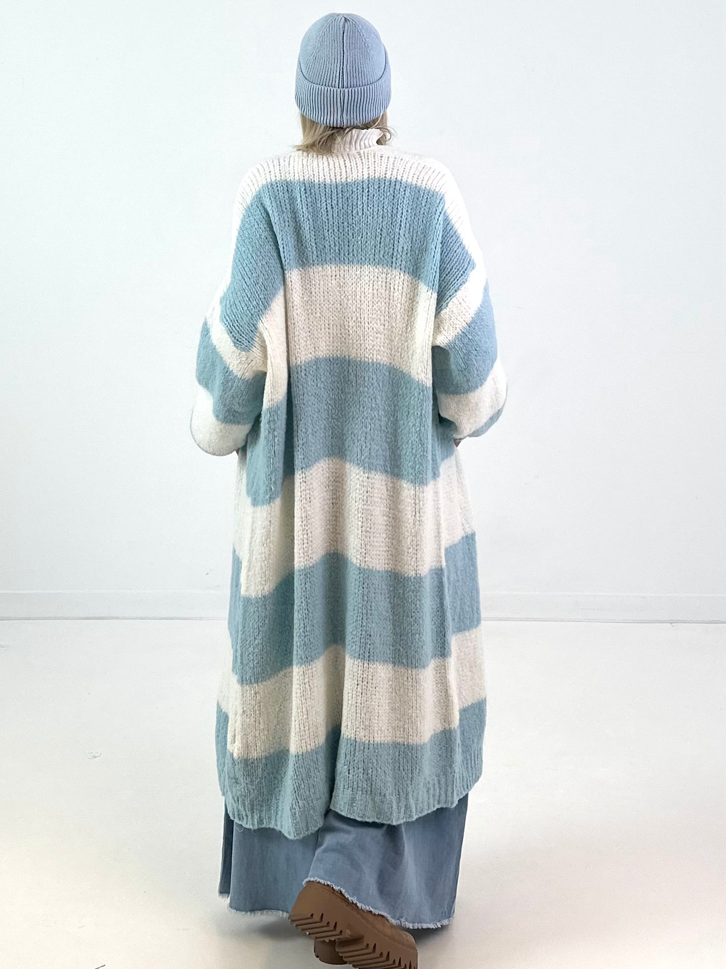 Maxi gebreide jas model "Soft Stripe" - blauw en wit