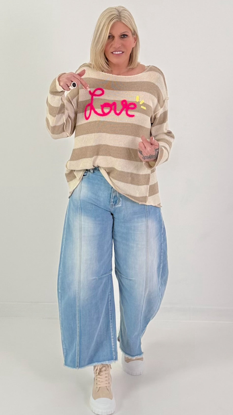 Gestreepte gebreide trui Love - beige-crème