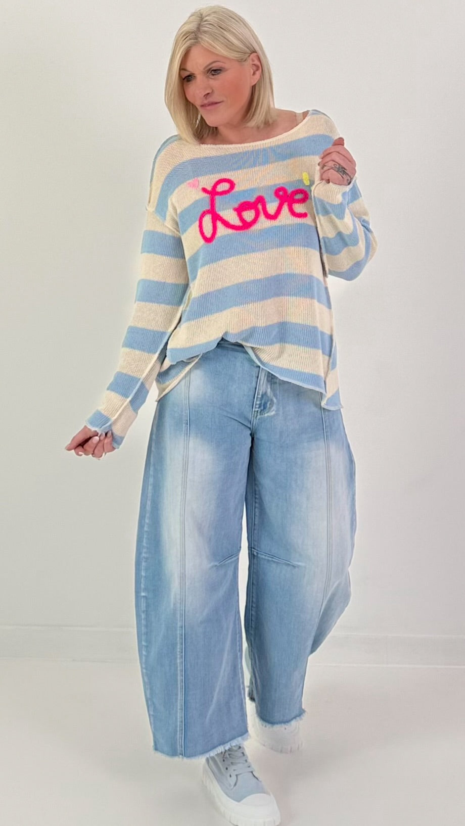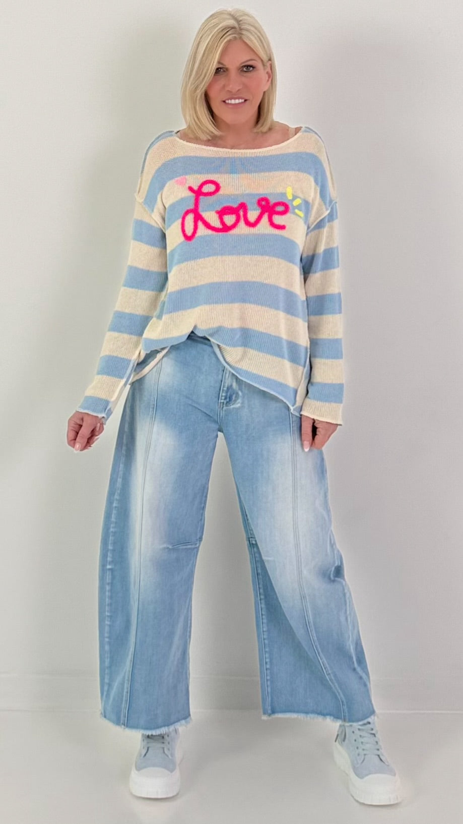 Gestreepte gebreide trui Love - lichtblauw en wit