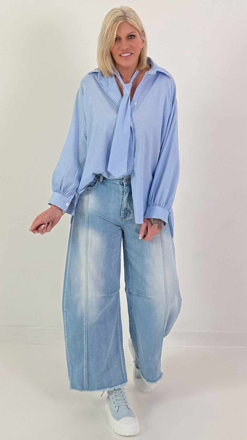 Overhemdblouse met strik - lichtblauw en wit