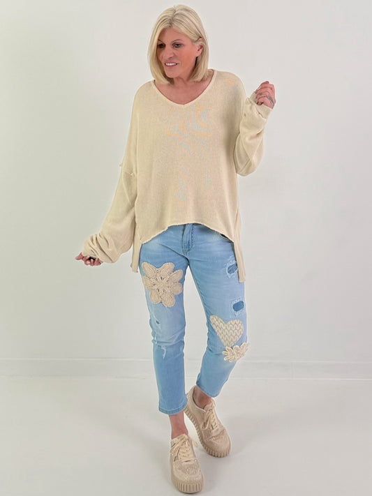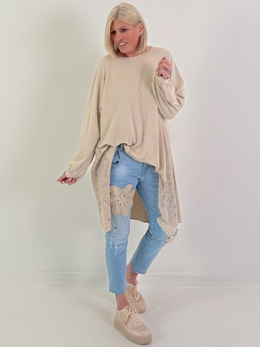Oversized Long-Shirt mit seitlichen Spitzeneinsätzen - beige