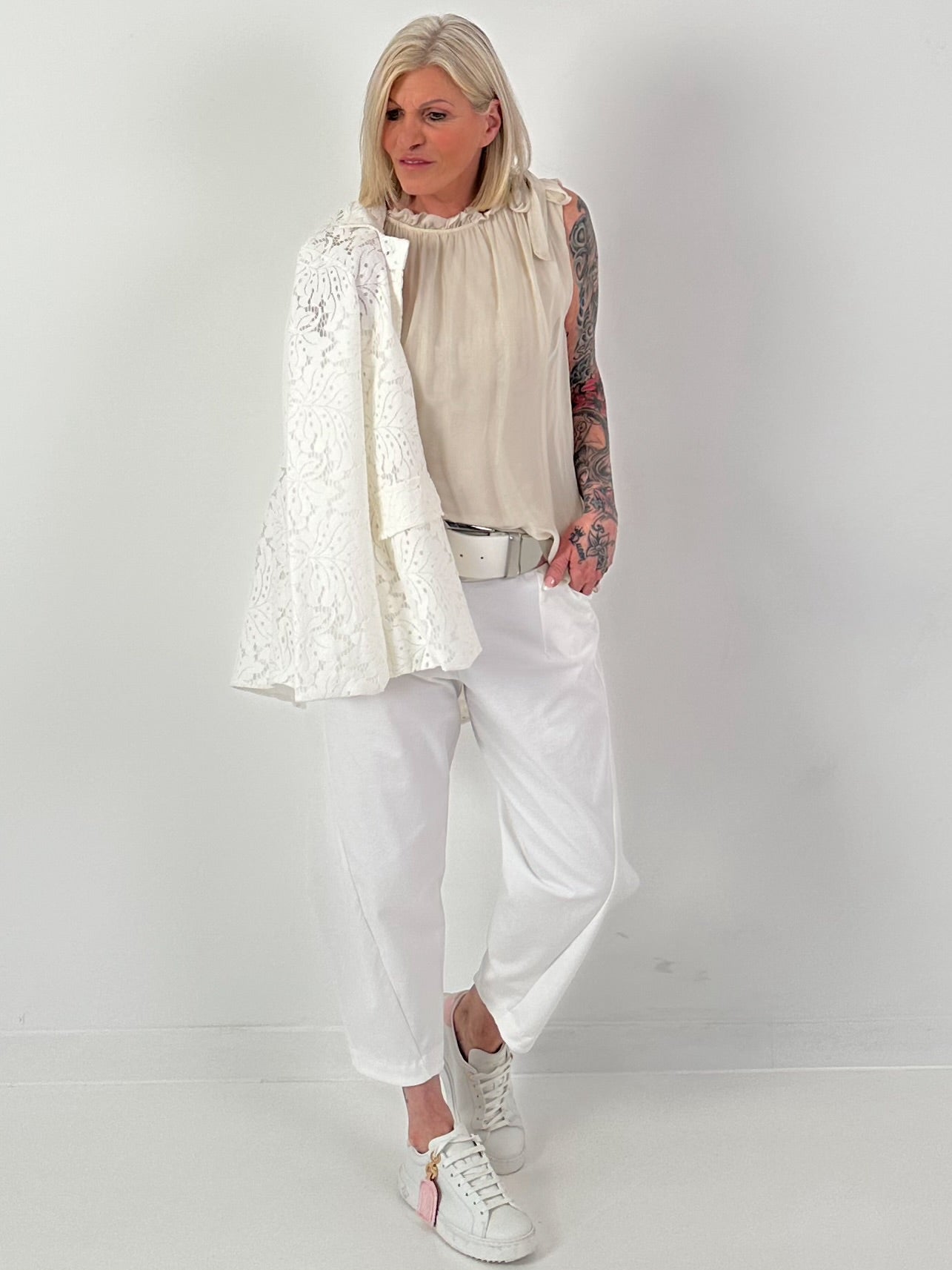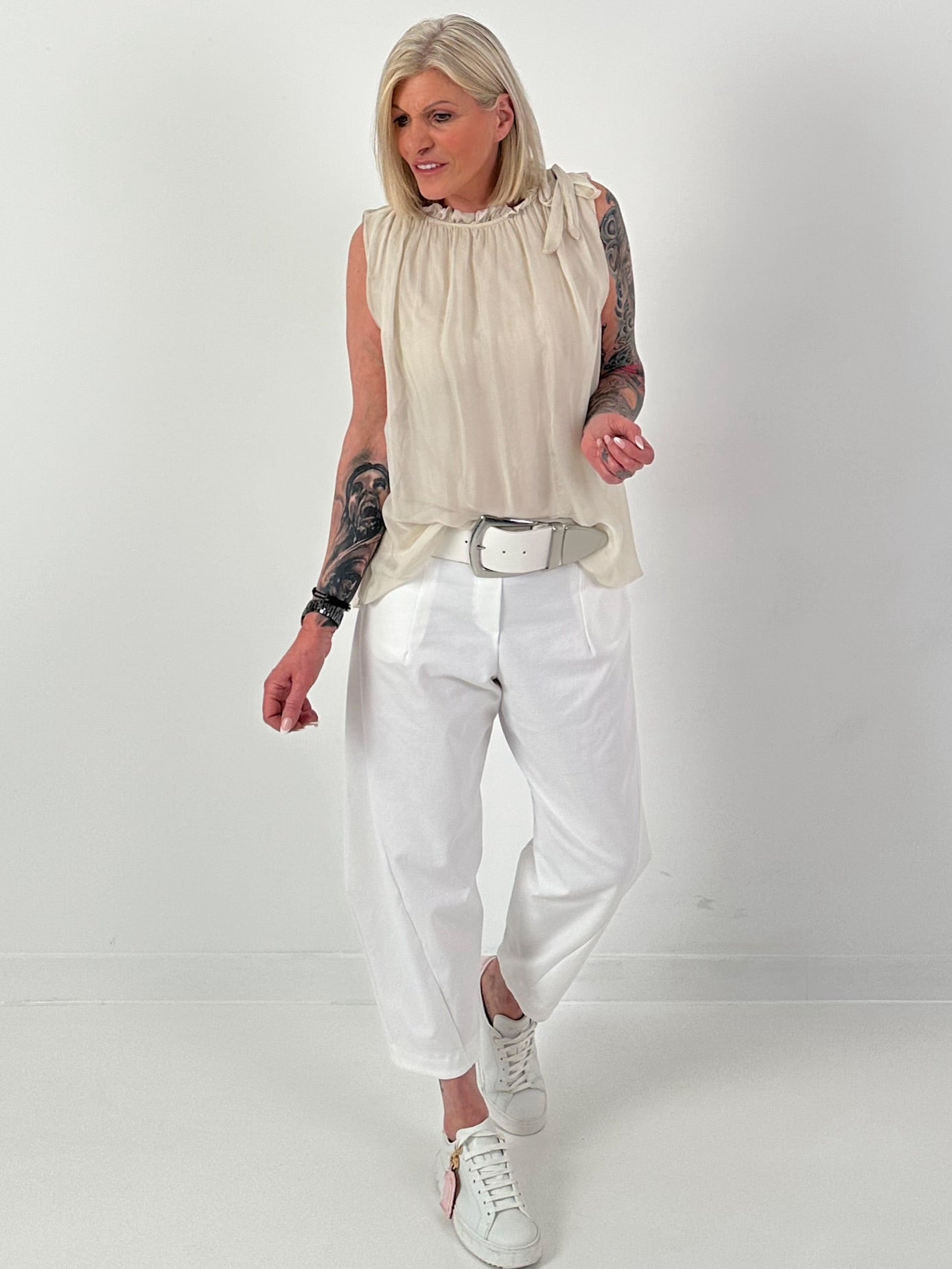 Seidentop mit Rüschenkragen und Schleife - beige
