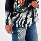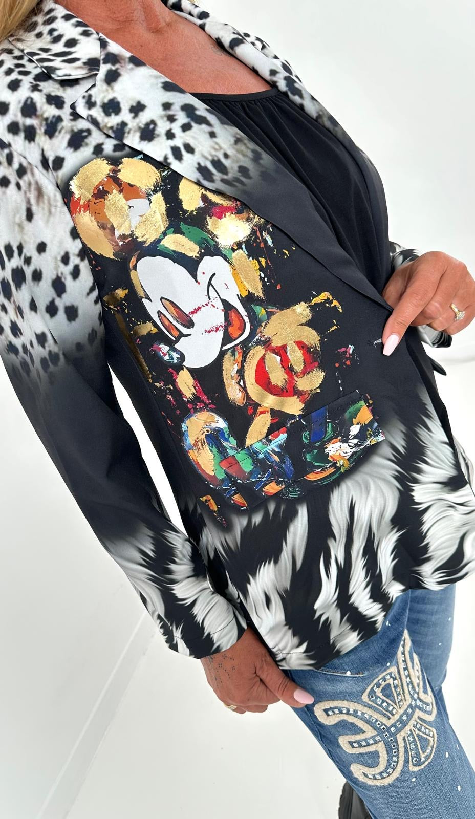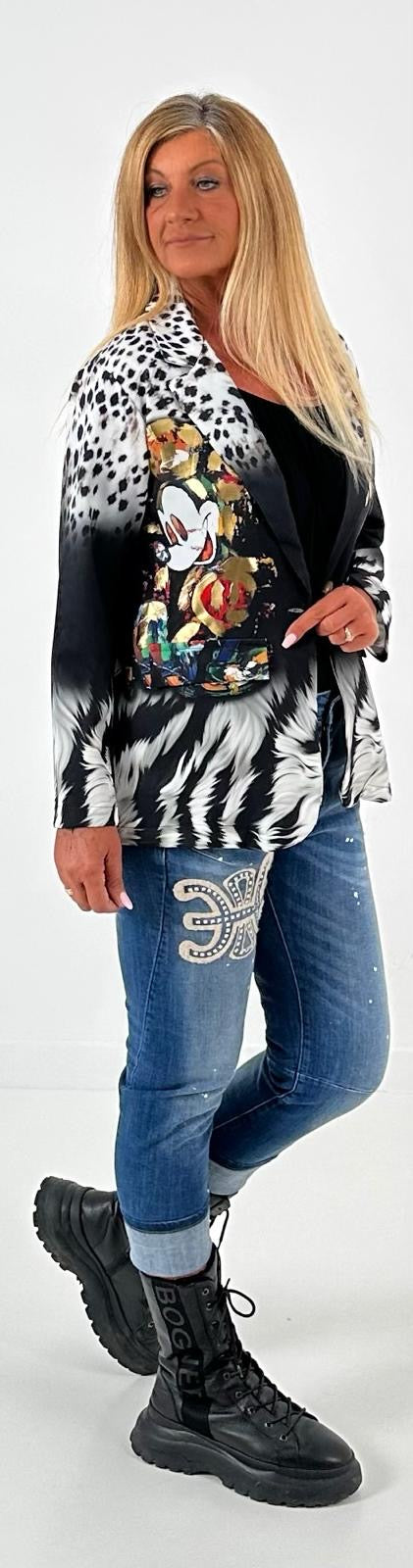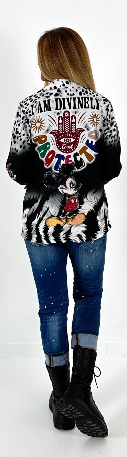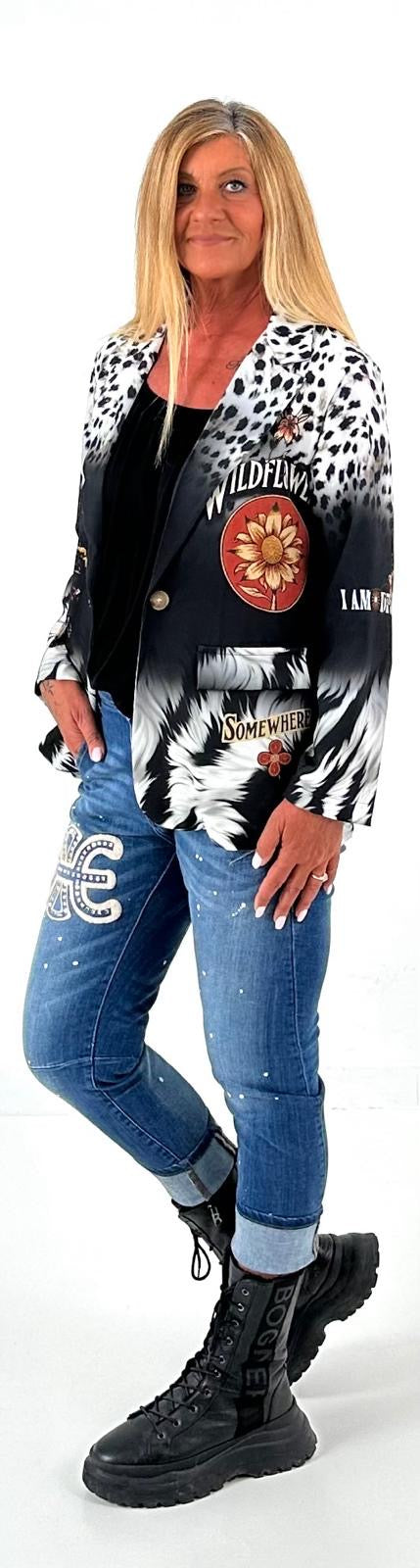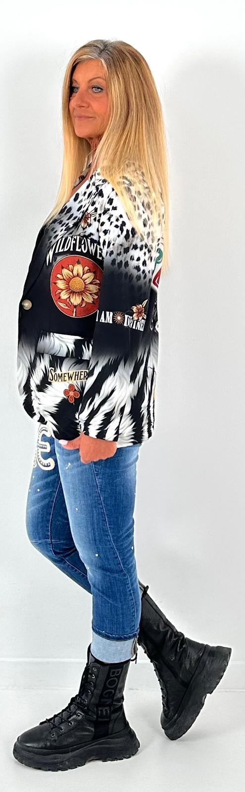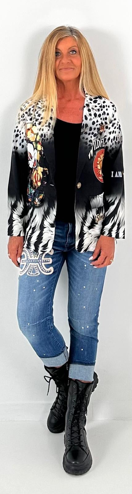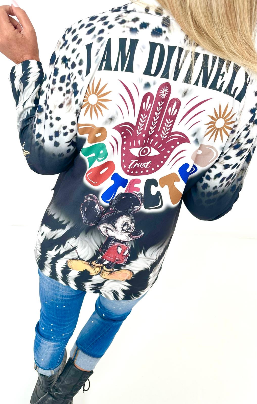 Wunderschöner, einzigartiger Blazer der durch 1 Knopf geschlossen werden kann. Er hat 2 Patten und ist aus einem leichten Material. Auffällige Drucke im Leo-Design mit inspirierenden Slogan "I AM DIVINELY PROTECTED" kombiniert mit Symbolen, die Schutz und Stärke repräsentieren und unser all geliebter kleiner Darsteller machen dieses Teilchen zu einem echten Hingucker. Egal wie du ihn stylst, dieser Blazer wird garantiert alle Blicke auf sich ziehen.