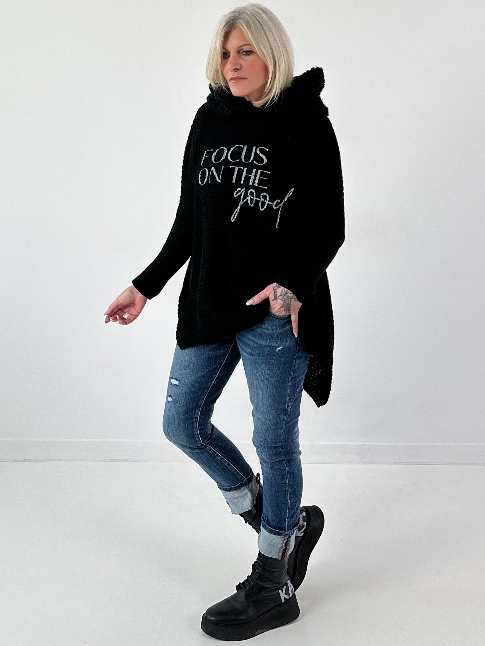 Ein oversized Strickpullover mit Wohlfühlgarantie. Der grobe Strick verleiht ihm Struktur, die weiche Teddykapuze sorgt für extra Komfort und einen lässigen Look. Überschnittene Arme und Rippbündchen an den Ärmeln bringen Form, der vorne leicht verkürzte Schnitt wirkt modern und einfach zu kombinieren. Der Schriftzug FOCUS ON THE GOOD setzt ein positives Statement . So startest du gemütlich und mit gutem Motto in deinen Tag.